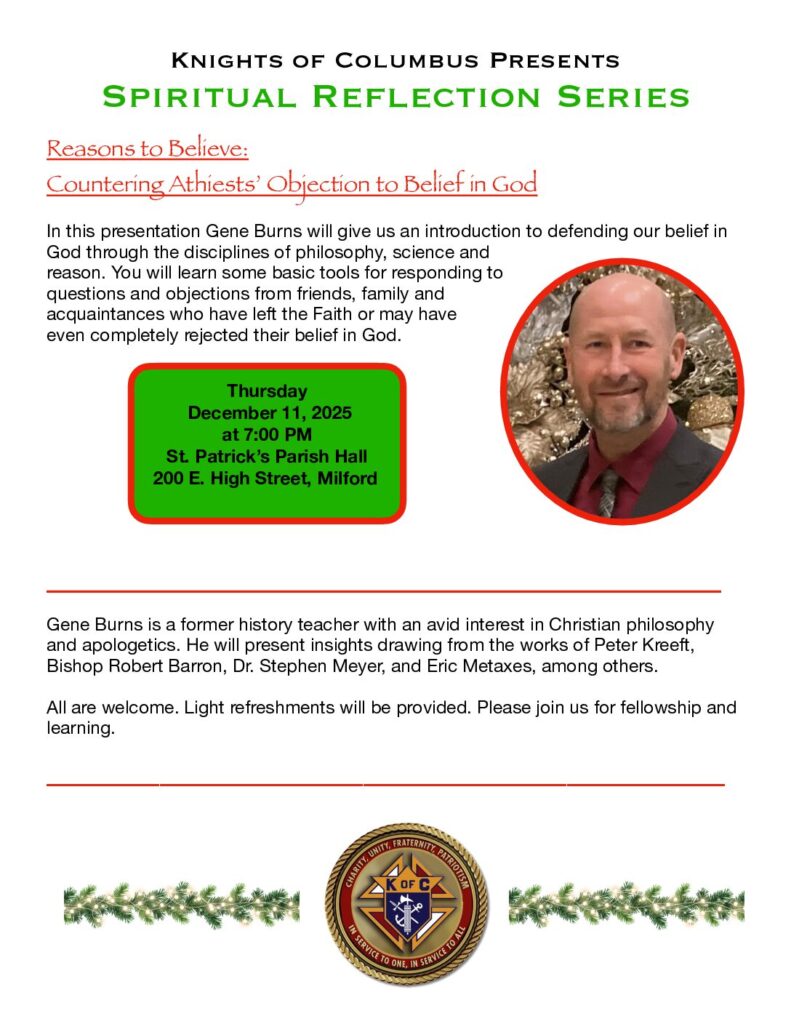 Join us on December 11th at 7pm at St Patrick’s Community Hall for Gene Burn’s second spiritual reflection on Catholic apologetics.